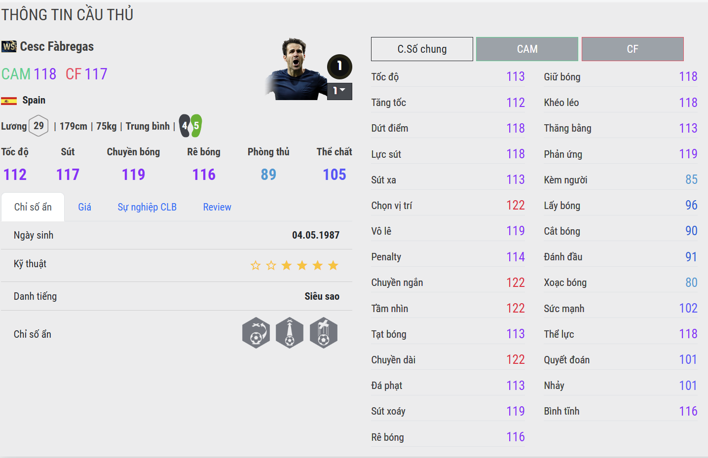 Fàbregas WS không phải mẫu cầu thủ chạy nhanh hay tăng tốc đột ngột. Tuy nhiên, anh bù lại bằng khả năng chọn vị trí và xoay người cực khôn ngoan. Ở vai trò CM hoặc CAM, cảm giác “đủ nhanh để không bị bắt bài, đủ bình tĩnh để chọn phương án tốt nhất” giúp anh luôn duy trì được nhịp tấn công. Không dành cho lối chơi tốc độ, nhưng hoàn hảo trong những pha build-up có chiều sâu.
