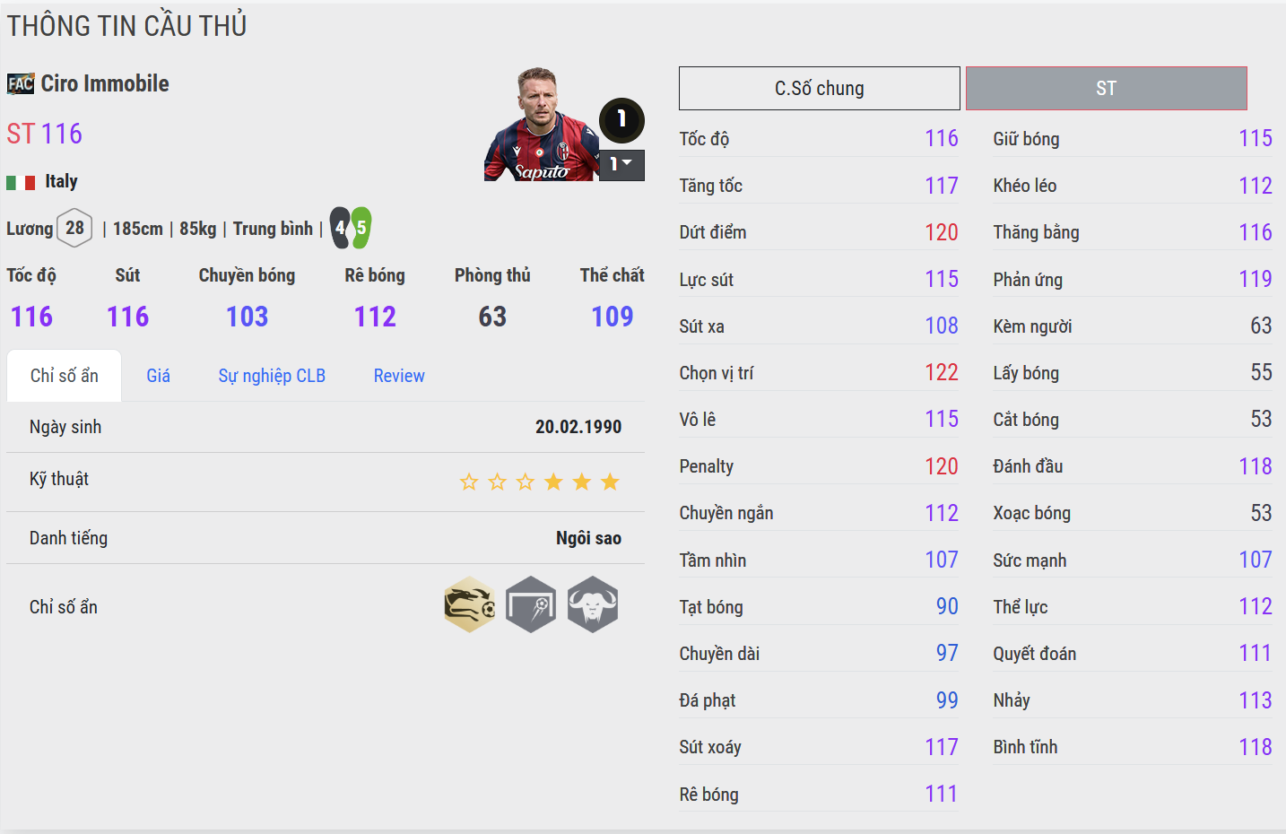Immobile FAC có thể hình ổn, khả năng tì đè ở mức khá, đủ để giữ bóng trong những tình huống quay lưng với khung thành. Dù không phải mẫu “cỗ xe tăng” chuyên càn lướt, anh vẫn có thể làm tường và tạo khoảng trống cho đồng đội nếu được hỗ trợ tốt.
