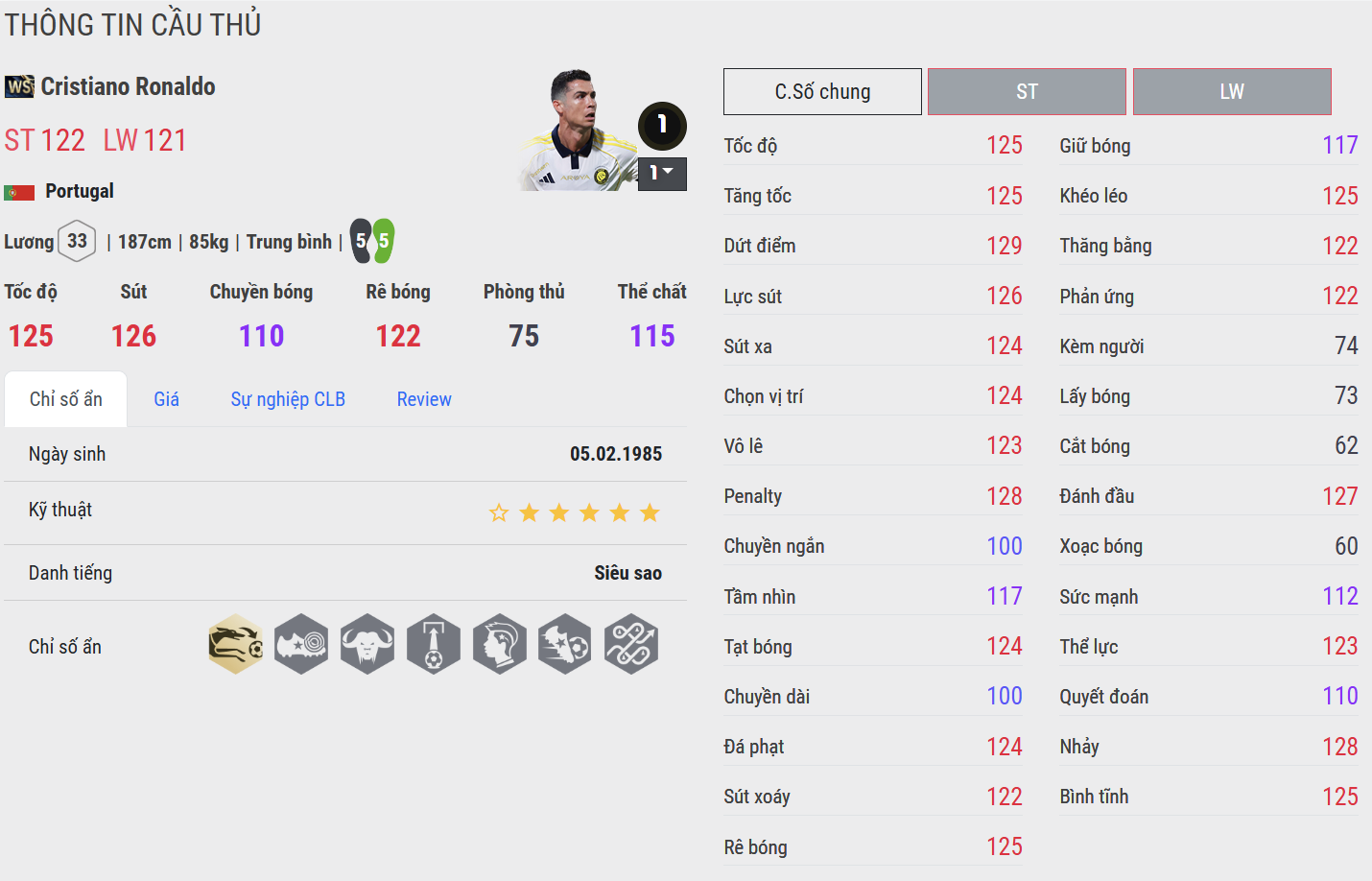 Một trong những điểm ăn tiền nhất của Ronaldo WS chính là khả năng chơi đầu. Anh bật nhảy dũng mãnh, chọn điểm rơi chuẩn xác và dứt điểm bằng đầu vô cùng uy lực. Đây là thứ vũ khí khiến mọi hàng thủ phải dè chừng, đặc biệt trong các tình huống tạt cánh.