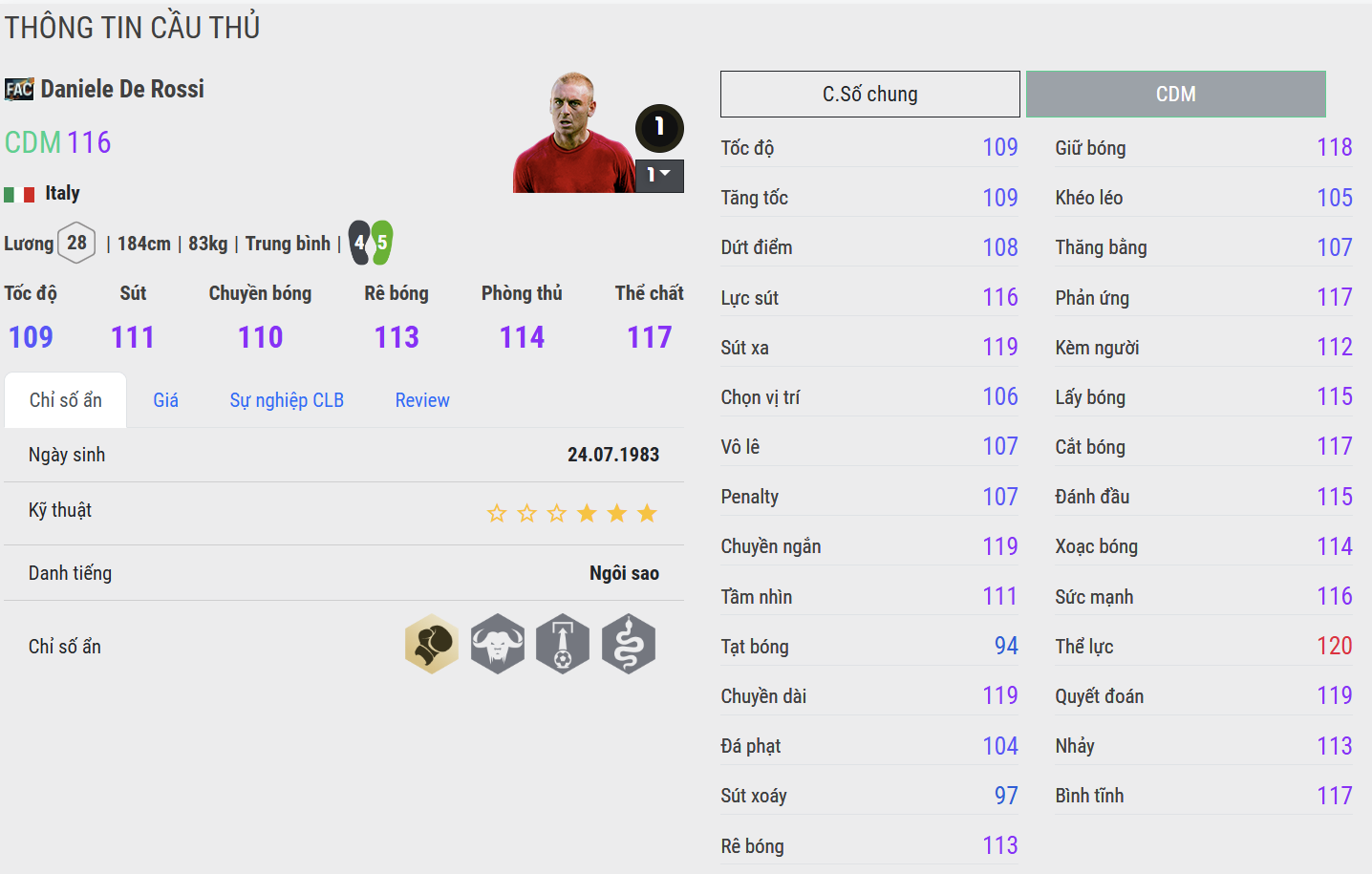 Daniele De Rossi là hiện thân của tinh thần Roma và mẫu tiền vệ phòng ngự mang đậm chất chiến binh của bóng đá Ý. Thi đấu với lối chơi mạnh mẽ, kỷ luật nhưng không kém phần thông minh, De Rossi luôn là điểm tựa vững chắc trước hàng phòng ngự.