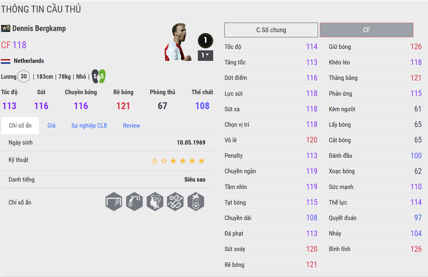 Khả năng rê bóng của Bergkamp WS là một bản hòa âm giữa kỹ thuật, sự thanh thoát và độ chuẩn xác. Mỗi pha chạm bóng đều có chủ đích, không thừa động tác. Anh không rê bóng để biểu diễn, mà để kiểm soát và mở ra không gian. Những pha xử lý một chạm, xoay compas hay ngoặt bóng đều cực kỳ mượt và chính xác. Cảm giác bóng của Bergkamp gần như “dính” vào chân, tạo cảm giác kiểm soát tuyệt đối. Với người chơi thiên về kỹ thuật nhẹ nhàng và tinh tế, đây là một trong những mẫu cầu thủ mang lại cảm giác sướng tay bậc nhất trong game.