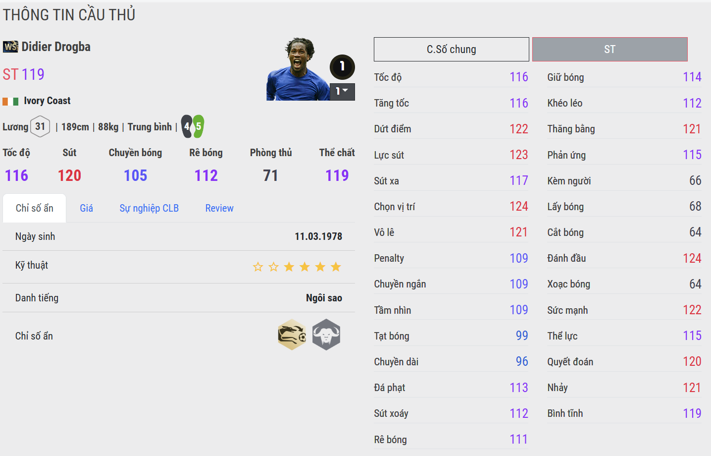 Không sai khi nói Drogba WS là một trong những tiền đạo tì đè khủng nhất game. Với chiều cao 1m89, nặng 91kg cùng thể hình Large, anh như một “tường thành” di động. Drogba có thể húc bay trung vệ đối phương, giữ bóng cực chắc trong các pha quay lưng. Khả năng tì đè của anh không chỉ mạnh, mà còn rất khéo, biết chọn góc và đè người hợp lý. Trong những pha tranh chấp tay đôi, Drogba gần như không có đối thủ – anh chiến thắng bằng cả sức mạnh lẫn sự lì lợm.