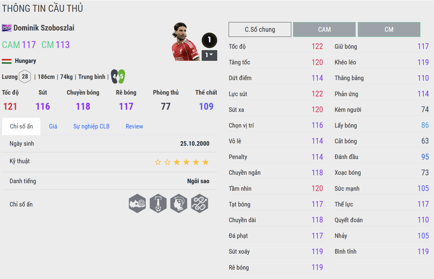 Szoboszlai 25DP không phải mẫu cầu thủ chạy tốc độ thuần túy, nhưng quãng tăng tốc ngắn và nhịp di chuyển của anh rất linh hoạt. Anh có thể thoát pressing hợp lý và tham gia các pha phản công, dù không “xé gió” như winger thuần túy, nhưng tốc độ đủ để tạo khoảng trống và phối hợp nhịp nhàng với đồng đội.