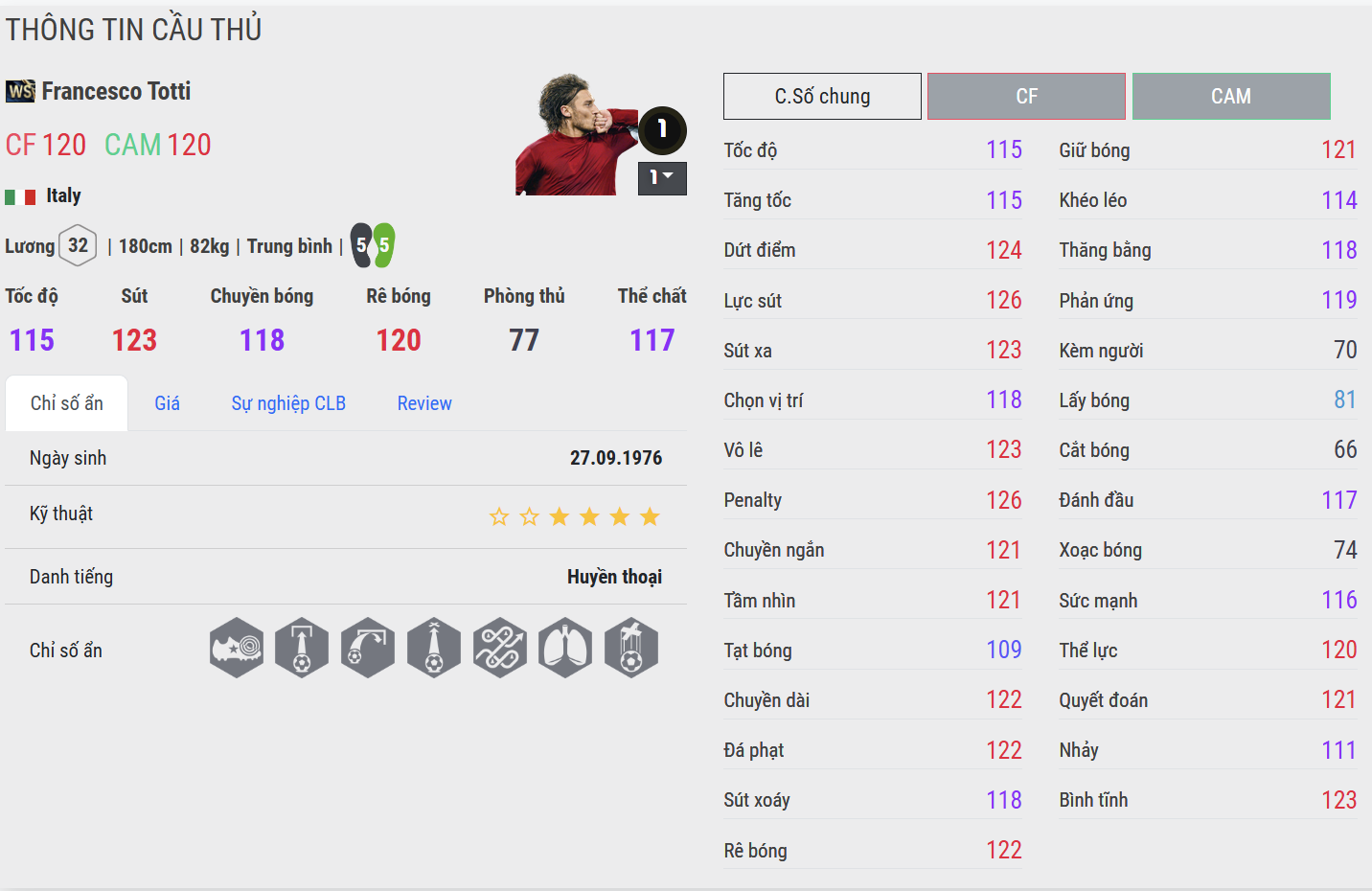 Totti sở hữu thể hình 1m80, nặng 82kg – không quá đồ sộ nhưng đủ chắc để giữ bóng. Anh biết cách dùng vai và thân trên để che chắn khi quay lưng, tạo thế chắn hợp lý để đối phương không dễ lấy bóng. Dù không có sức mạnh kiểu Drogba hay Rooney, nhưng khả năng đọc tình huống và điều chỉnh trọng tâm giúp Totti WS giữ được thăng bằng rất tốt. Ở những pha xoay người trong khu vực hẹp, anh gần như không bị đẩy ngã, nhờ nền tảng thể lực ổn và sự khôn ngoan trong di chuyển.