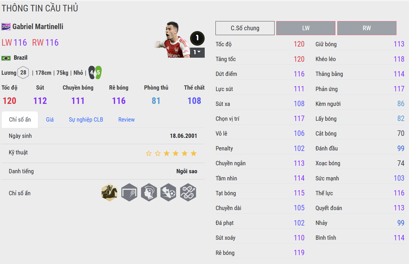 Martinelli không phải mẫu cầu thủ dùng vai để “đấu vật”, nhưng phiên bản 25DP cải thiện đôi chút thể chất. Anh đủ lực để chịu va chạm trong các pha bứt tốc, không dễ bị húc văng ngay lập tức. Tuy nhiên, nếu tranh chấp trực diện với hậu vệ lực tốt thì vẫn thua thiệt. Đây là cầu thủ mà bạn cần bảo toàn đà chạy để phát huy tối đa sức mạnh, thay vì đối kháng tay đôi.