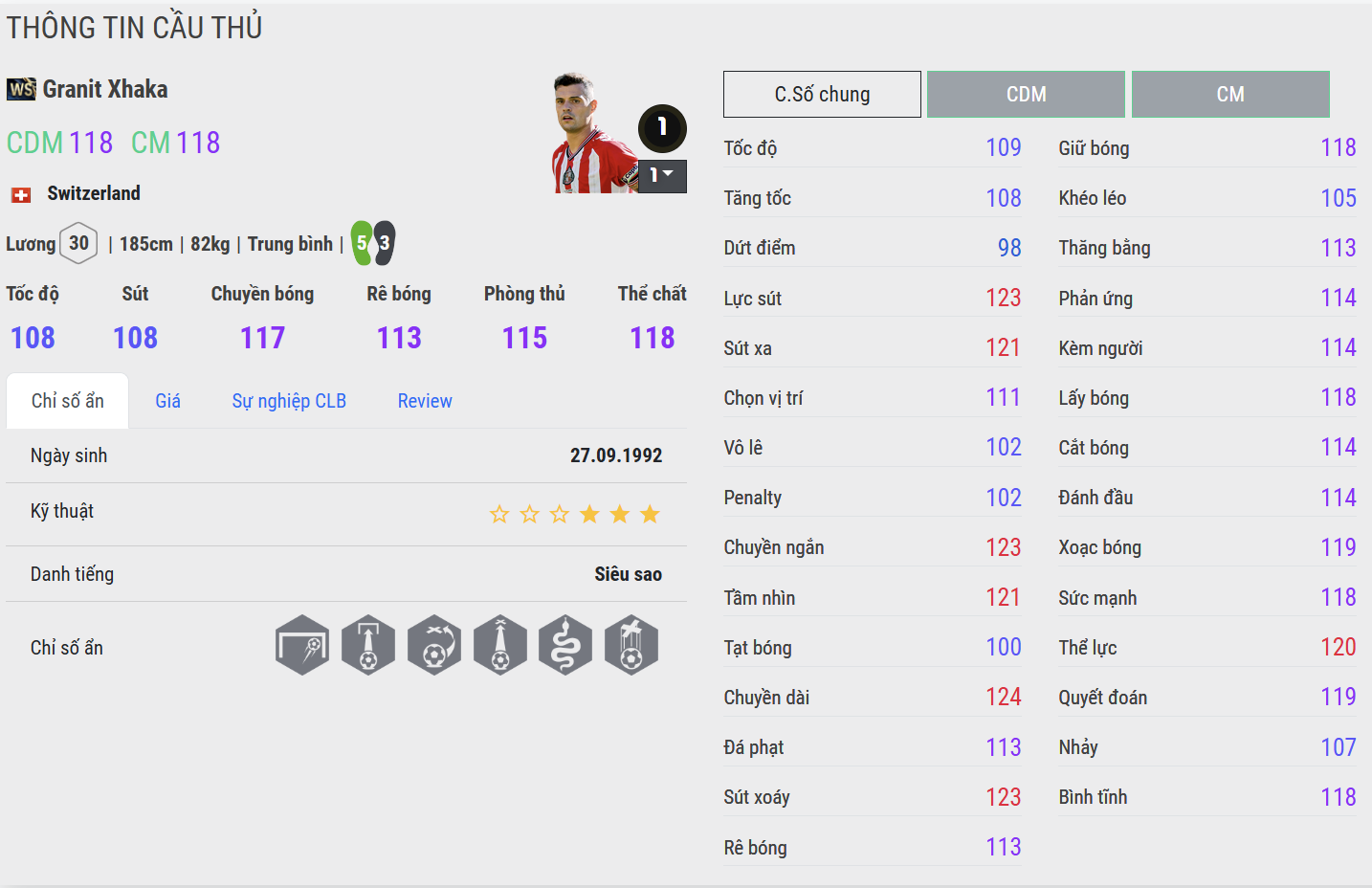 Với thể hình 1m86, nặng 82kg, Xhaka WS là một khối thép thực thụ nơi trung tuyến. Anh tì đè cực kỳ chắc, dùng vai khéo léo và có độ nặng trong va chạm. Khi áp sát hoặc tranh chấp tay đôi, Xhaka thường giành phần thắng nhờ thể lực dồi dào và thăng bằng tốt. Cảm giác “đè người” của anh trong game rất thật, tạo nên sự áp đảo ở khu vực giữa sân. Nếu cần một CDM hoặc CM có thể vừa giữ bóng, vừa đè nặng đối phương, Xhaka WS là lựa chọn đáng tin cậy.