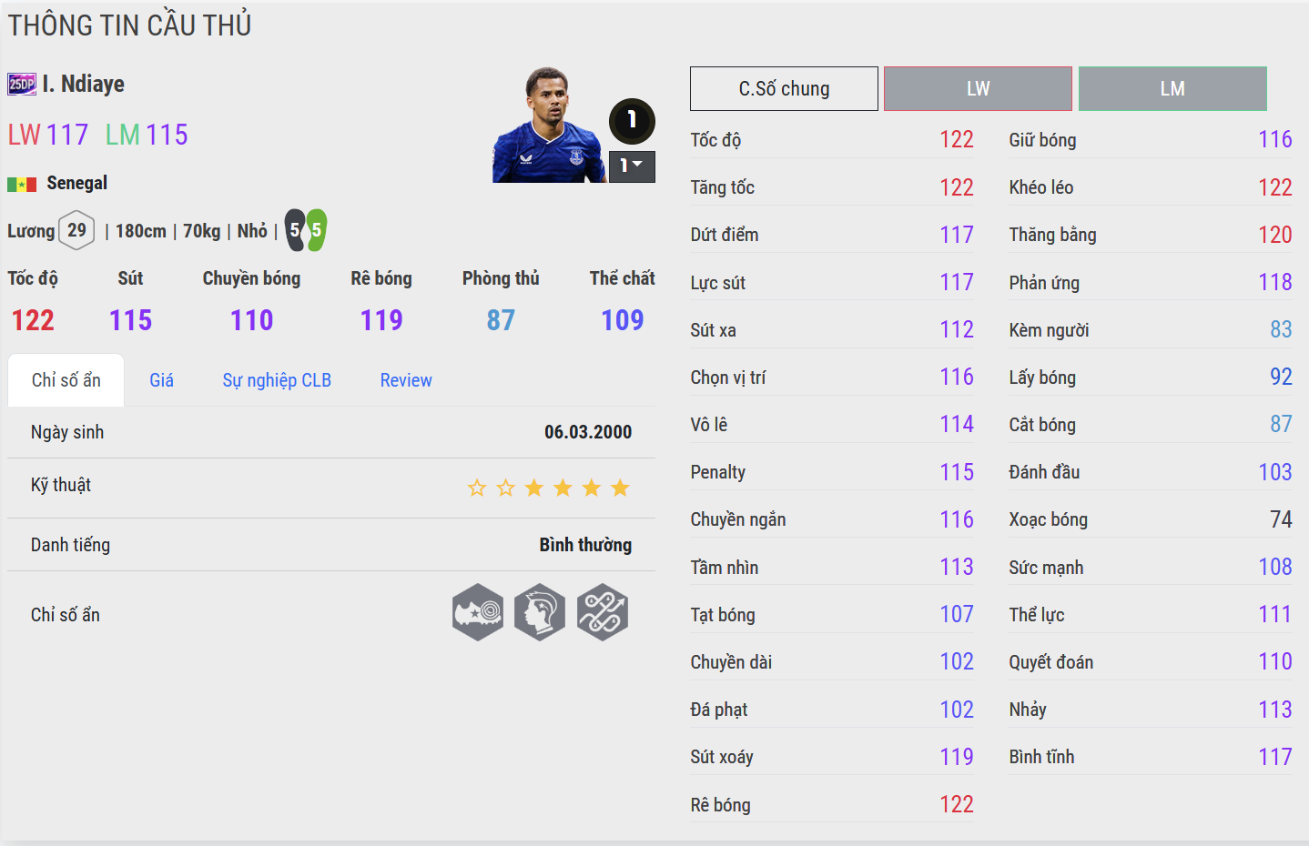 Đây là điểm khiến Ndiaye 25DP trở nên rất thú vị. Anh rê bóng cực mềm, có độ lắt léo tự nhiên, giao bóng sát chân và dùng thân người để che bóng tốt. Các pha đổi hướng, step-over, kéo bóng… đều rất gọn và có độ trễ thấp. Khi solo 1v1, Ndiaye dễ khiến đối thủ “mất dấu” nhờ cách giữ bóng giàu nhịp điệu và khả năng bùng nổ trong một tích tắc. Nếu bạn thích kiểu rê bóng nghệ thuật nhưng vẫn thực chiến, Ndiaye là lựa chọn rất hợp.