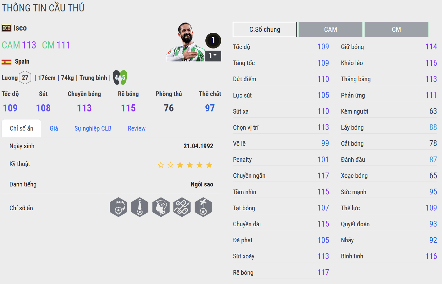 Isco mùa thẻ DCB mang đến hình ảnh một tiền vệ công tinh tế, mềm mại và giàu tính sáng tạo. Đây là mẫu cầu thủ phù hợp cho lối chơi kiểm soát bóng, thiên về kỹ thuật và sự đột biến thay vì tốc độ hay sức mạnh.