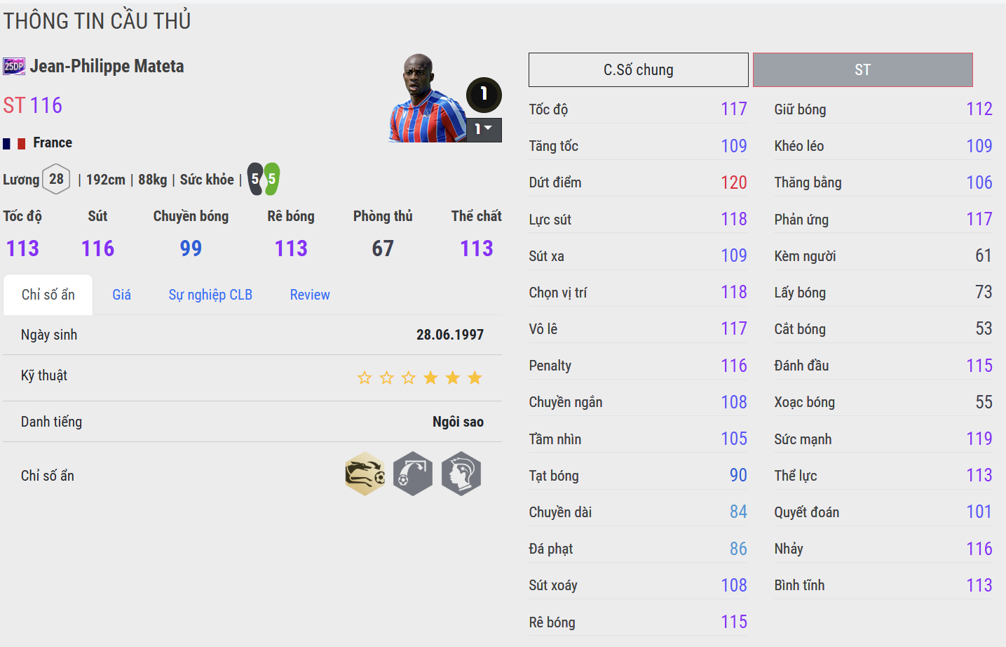Jean-Philippe Mateta là mẫu trung phong hiện đại đang ngày càng khẳng định tên tuổi nhờ thể hình lý tưởng, khả năng tì đè mạnh mẽ và sự sắc bén trong vòng cấm. Sở hữu chiều cao vượt trội cùng những bước chạy dứt khoát, Mateta luôn biết cách tận dụng lợi thế cơ bắp để che chắn, làm tường và tạo khoảng trống cho đồng đội.