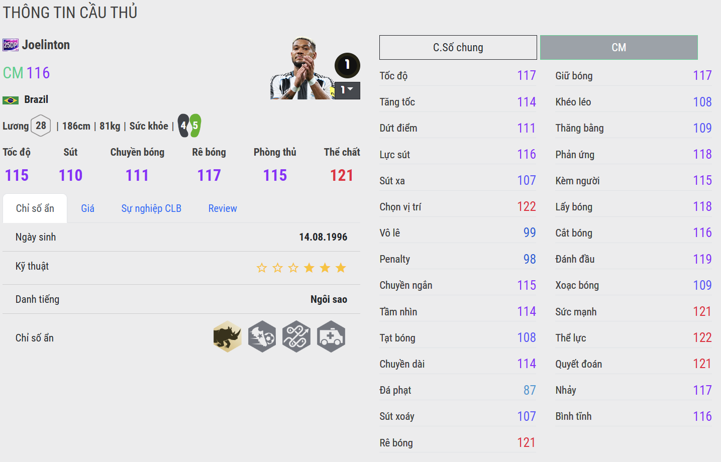 Joelinton 25DP dứt điểm mạnh mẽ và khá ổn định. Các cú sút lực thẳng, QD hoặc xoay người dứt điểm đều cho ra lực bóng tốt. Khả năng đánh đầu của anh cũng đáng tin nhờ thể hình lớn. ZD không quá nổi bật, nhưng những pha băng lên từ tuyến hai để dứt điểm một chạm lại rất chất lượng. Đây không phải kiểu sát thủ, nhưng đủ để trở thành mối đe dọa khi được đẩy lên đá CF thỉnh thoảng.