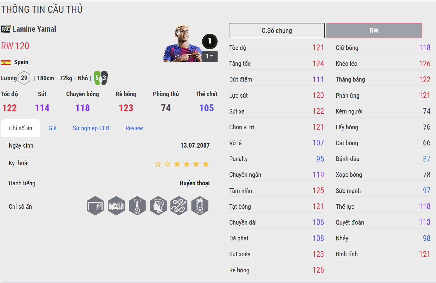 Với thể hình mảnh và sức mạnh không phải điểm mạnh, Yamal FAC khó thắng trong các pha tranh chấp vai. Tuy nhiên, nhờ thân người linh hoạt và khả năng che bóng bằng kỹ thuật, Yamal vẫn giữ bóng ổn nếu người chơi biết dùng hướng xoay hợp lý. Không nên dùng thẻ này để đâm thẳng vào hậu vệ to khỏe, mà hãy khai thác sự nhanh, khéo và khôn trong từng pha xử lý.