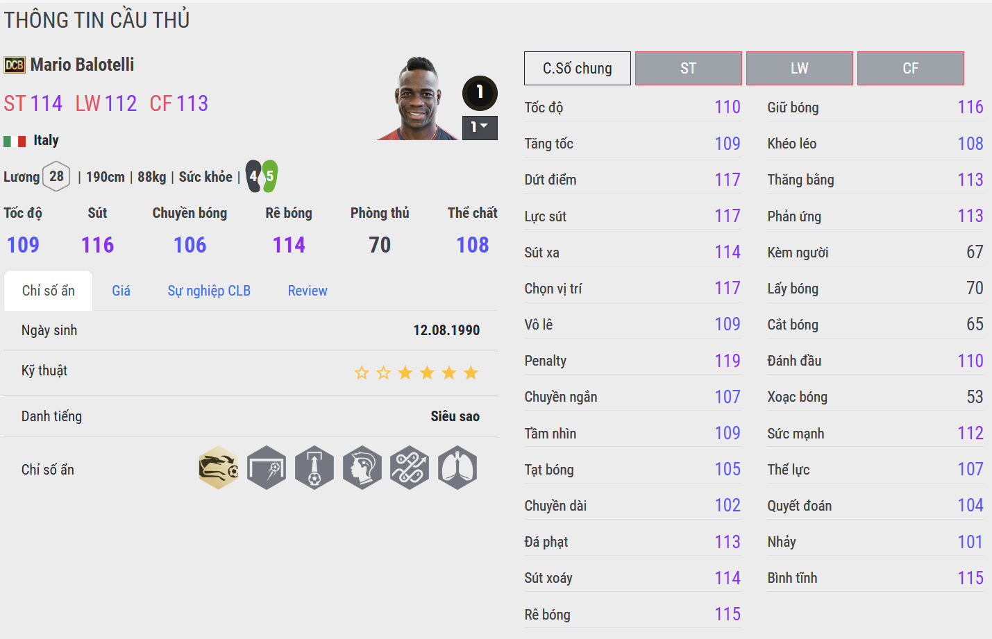 Mario Balotelli – tiền đạo đầy cá tính của bóng đá Ý, là một trong những nhân tố gây nhiều tranh cãi nhất trong làng túc cầu thế giới. Sở hữu thể hình mạnh mẽ, tốc độ bứt phá và khả năng dứt điểm đa dạng, Balotelli từng được kỳ vọng trở thành ngôi sao lớn của bóng đá châu Âu.