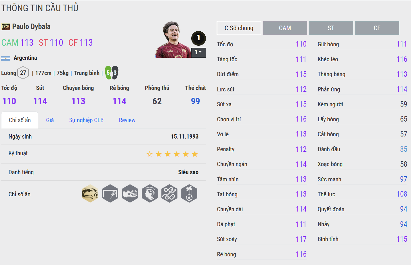Dybala DCB sở hữu tốc độ khá, đủ để thoát pressing và giữ sự linh hoạt khi di chuyển. Tuy nhiên, anh không phải mẫu bứt tốc thần tốc, nên việc tận dụng Dybala hiệu quả nhất là ở những pha di chuyển thông minh thay vì chạy đua thể lực.