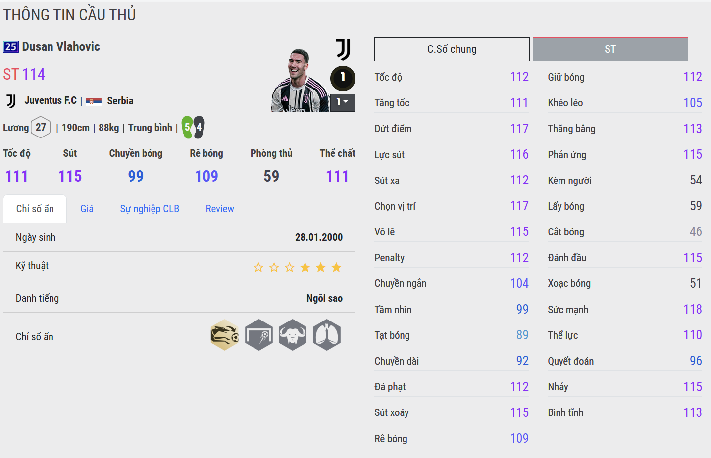 Dusan Vlahovic là mẫu trung phong hiện đại hội tụ đầy đủ sức mạnh, bản năng săn bàn và sự sắc lạnh trong vòng cấm. Anh không cần quá nhiều chạm để tạo khác biệt, nhưng mỗi pha xử lý đều mang tính sát thương cao. Điểm nổi bật nhất của Vlahovic nằm ở khả năng dứt điểm đa dạng và quyết đoán.