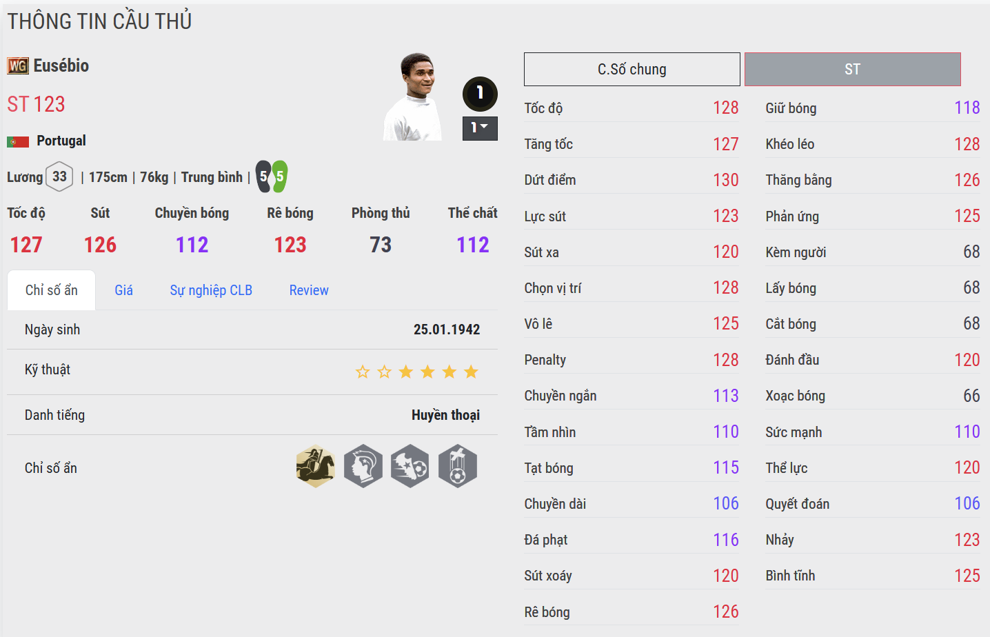 Eusébio là biểu tượng vĩ đại của bóng đá Bồ Đào Nha, một tiền đạo mang trong mình sự kết hợp hoàn hảo giữa sức mạnh, tốc độ và bản năng săn bàn đáng sợ. Điểm nổi bật nhất của Eusébio nằm ở khả năng dứt điểm toàn diện.