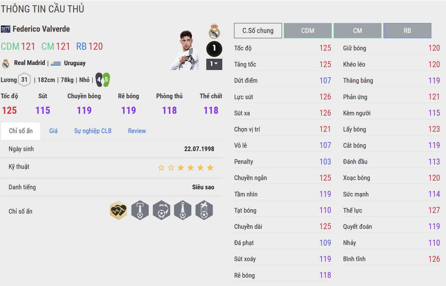 Tốc độ là một trong những điểm mạnh nhất của Valverde 26TOTY. Khả năng bứt tốc tốt giúp anh lên xuống liên tục, hỗ trợ phòng ngự và sẵn sàng xâm nhập vòng cấm ở tuyến hai. Trong thực chiến, Valverde cho cảm giác di chuyển rất “thoáng”, không bị ì hay chậm nhịp, đặc biệt hiệu quả khi đội hình chơi chuyển trạng thái nhanh.