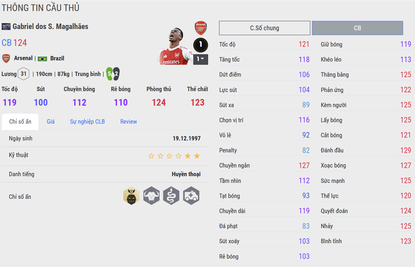 Với thể hình và sức bật ấn tượng, Gabriel 26TOTY cực kỳ mạnh trong các pha tranh chấp bóng bổng. Dù là phòng ngự hay tham gia các tình huống cố định, anh luôn chiếm ưu thế rõ rệt. Khả năng chọn vị trí và bật nhảy tốt giúp Gabriel trở thành mối đe dọa thường trực trong vòng cấm đối phương.