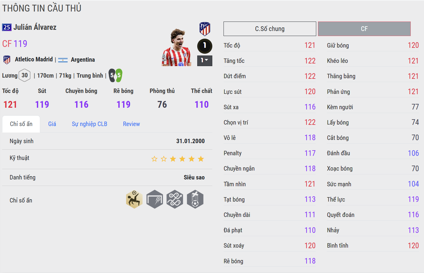 Alvarez không phải kiểu “xé gió” như những tiền đạo thiên tốc độ, nhưng gia tốc của anh rất gọn và đủ sắc để tạo lợi thế trong 1–2 nhịp đầu tiên. Trong thực chiến, cảm giác bứt tốc của 25UCL thiên về sự linh hoạt hơn là sức rướn. Anh xoay trở nhanh trong phạm vi hẹp, chuyển hướng mượt và đặc biệt hiệu quả ở những tình huống thoát pressing hoặc băng cắt chéo mặt hậu vệ. Điểm trừ nhỏ nằm ở quãng nước rút dài – nếu bị CB cao to áp sát liên tục, Alvarez sẽ khó duy trì lợi thế tốc độ quá lâu.