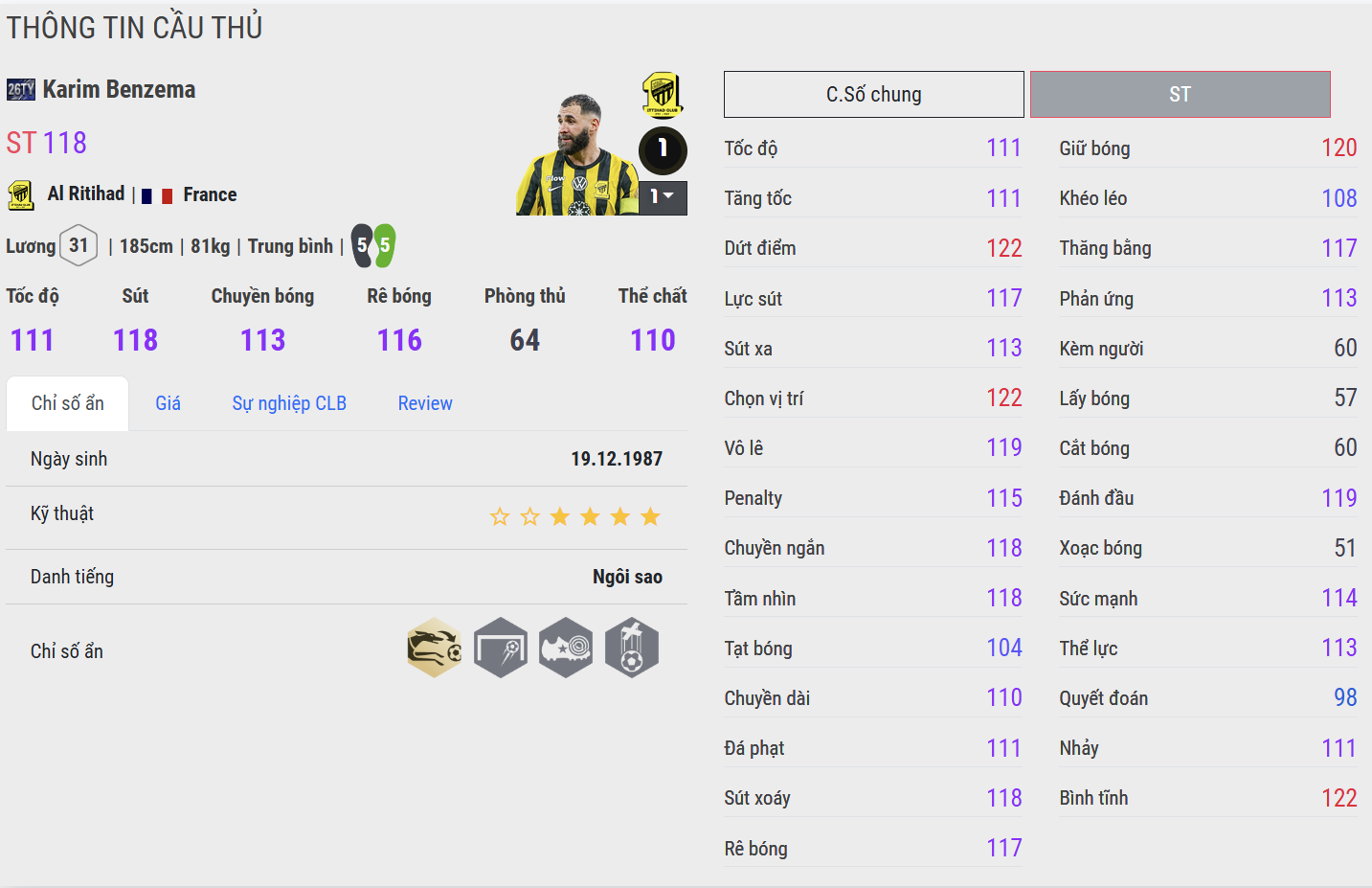 Benzema 26TOTY không phải mẫu tiền đạo thuần tốc độ. Tăng tốc quãng ngắn ở mức khá, đủ để chiếm lợi thế trong 1–2 nhịp đầu tiên. Tuy nhiên nếu yêu cầu bứt phá đường dài vượt qua CB nhanh, anh không phải lựa chọn tối ưu. Điểm đáng giá nằm ở khả năng chọn vị trí thông minh, giúp anh không cần quá phụ thuộc vào tốc độ thuần.