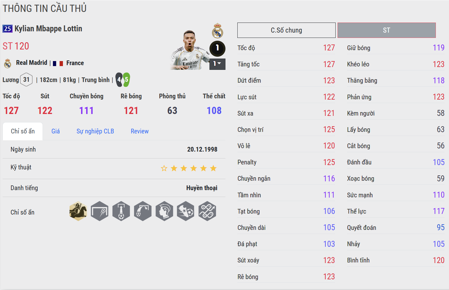 Mbappe 25UCL dứt điểm rất ổn định trong vòng cấm. Sút chéo góc chân thuận cực kỳ khó chịu, bóng đi gọn và hiểm. Những pha đối mặt thủ môn xử lý khá lạnh lùng, ít khi bỏ lỡ cơ hội rõ ràng. Sút xa ở mức khá, nhưng nguy hiểm nhất vẫn là những tình huống băng cắt và dứt điểm nhanh sau khi vượt qua hàng thủ.