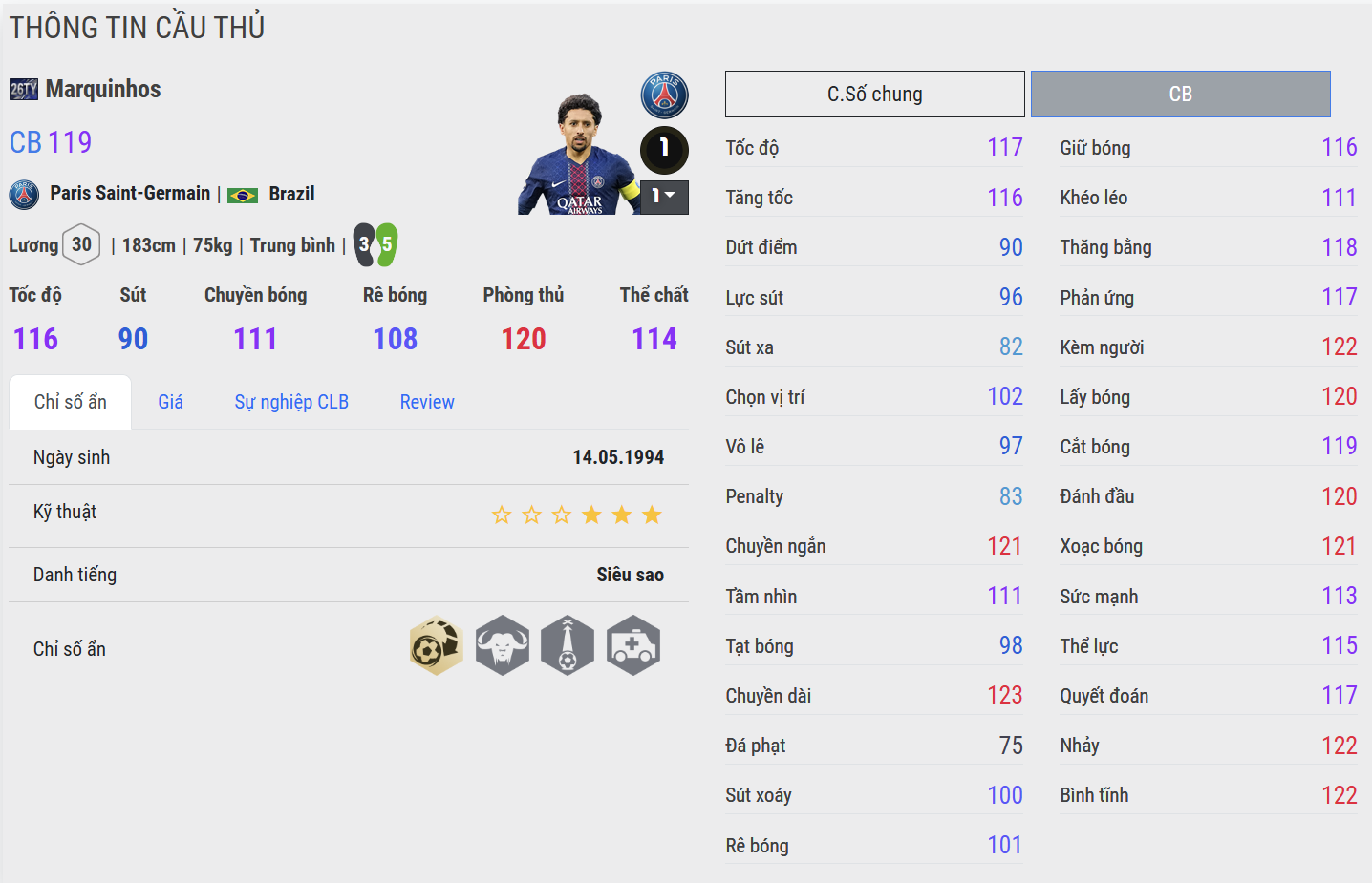 Marquinhos không phải “quái vật cơ bắp”, nhưng lại có nền tảng thể chất rất cân bằng. Trong các pha so vai, anh đứng vững nhờ thăng bằng và sức mạnh ổn định. Khả năng che người và ép tiền đạo ra khỏi khu vực nguy hiểm khá tốt. Điểm đáng giá là sự dẻo dai: anh không cần dùng quá nhiều sức, mà tận dụng vị trí và thời điểm để giành lợi thế.