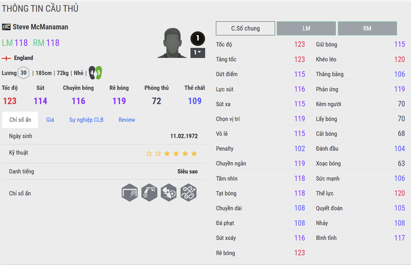 Tốc độ của McManaman FAC ở mức khá, không quá bùng nổ trong những pha nước rút ngắn, nhưng lại rất “đã tay” khi bám biên và tăng tốc theo nhịp chạy dài. Cảm giác điều khiển nhẹ, linh hoạt giúp anh duy trì tốc độ ổn định trong suốt pha lên bóng, phù hợp với lối chơi kiểm soát và đánh biên cổ điển.