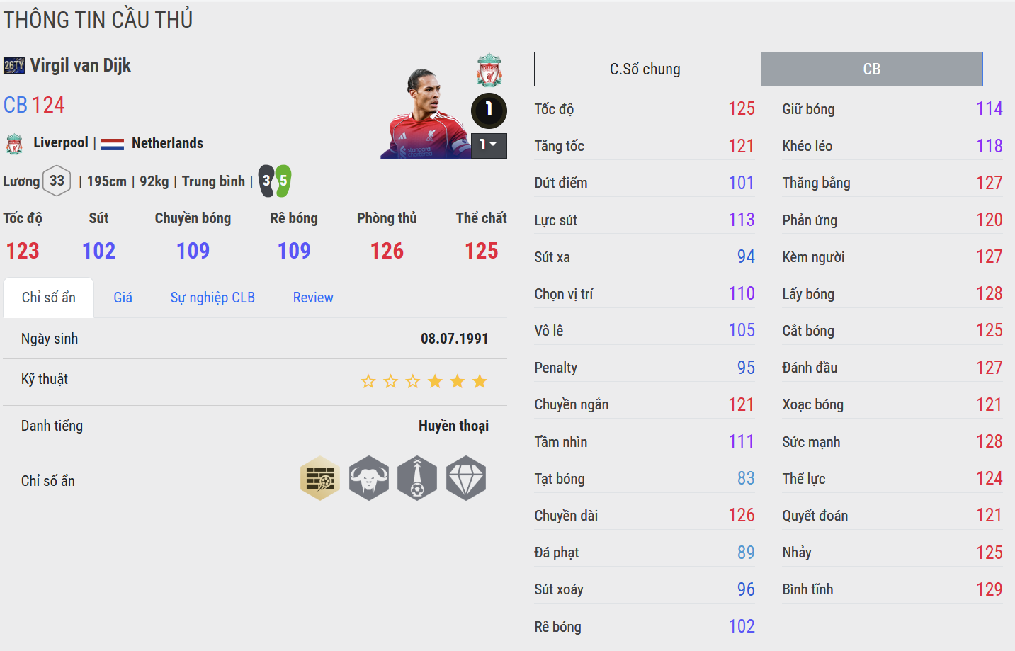 Tốc độ của Van Dijk 26TOTY không thuộc nhóm nhanh nhất, nhưng hoàn toàn đủ dùng nhờ sải chân dài và khả năng phán đoán tình huống xuất sắc. Anh không cần đua tốc độ liên tục, bởi việc giữ vị trí hợp lý giúp Van Dijk luôn ở thế chủ động, hạn chế tối đa những pha phải rượt đuổi bất lợi.