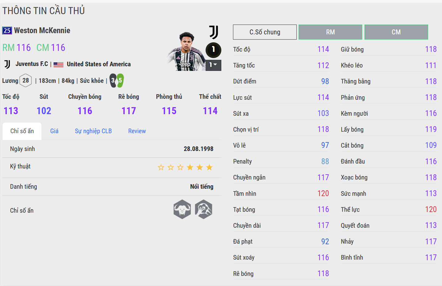 Weston McKennie là mẫu tiền vệ trung tâm giàu năng lượng, nổi bật với khả năng hoạt động rộng và tinh thần thi đấu mạnh mẽ. Trong màu áo Juventus F.C., anh đóng vai trò như một “cỗ máy” nơi tuyến giữa, luôn sẵn sàng tham gia vào cả tấn công lẫn phòng ngự.