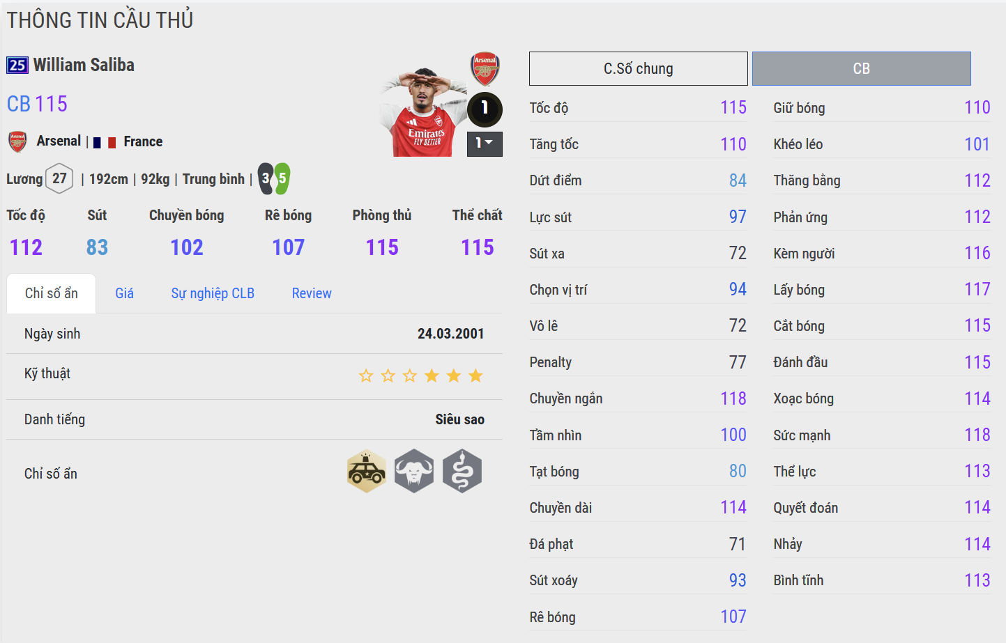 Bên cạnh đó, thể hình tốt cùng khả năng không chiến ổn định giúp anh chiếm ưu thế trong các pha bóng bổng, đồng thời giữ vững sự chắc chắn trong những tình huống đối đầu trực tiếp. Với phong cách thi đấu chững chạc, kỷ luật và hiệu quả, Saliba là hình mẫu trung vệ hiện đại – nơi sự tỉnh táo và ổn định trở thành nền tảng cho một hàng phòng ngự vững chắc.