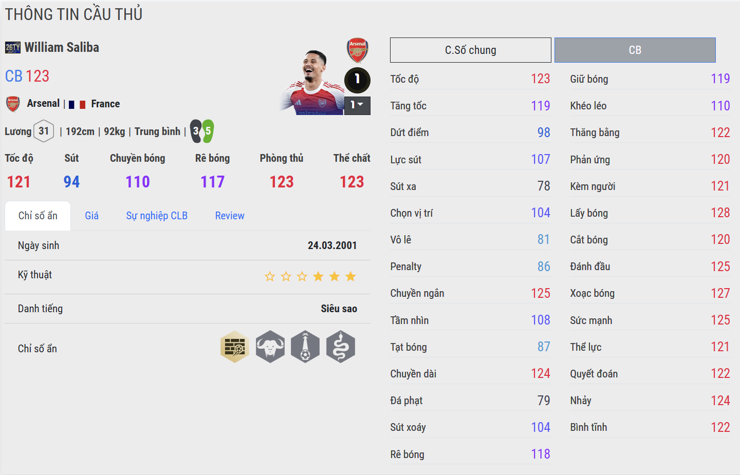 Tốc độ của Saliba 26TOTY thuộc nhóm rất tốt so với mặt bằng trung vệ. Khả năng tăng tốc nhanh giúp anh theo kèm các tiền đạo tốc độ cao, bọc lót hiệu quả khi hàng thủ dâng cao. Nhờ sải chân dài và nhịp chạy mượt, Saliba xử lý tốt các tình huống phòng ngự chuyển trạng thái – điểm cộng lớn trong meta hiện tại.