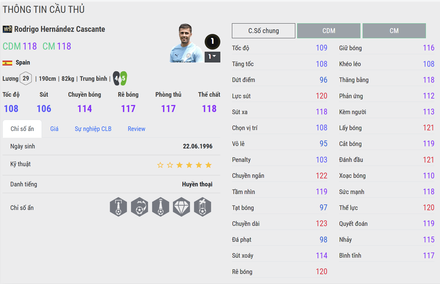Với chiều cao 1m90, thể hình trung bình – to và trọng lượng ổn định, Rodri WS là bức tường thật sự giữa sân. Anh tì đè cực kỳ chắc chắn, đè được cả những tiền đạo cao to nhờ thăng bằng tốt và sức mạnh cơ bắp. Khi tranh chấp, Rodri hiếm khi mất thế, thường dùng vai và thân người để đẩy đối phương lệch khỏi quỹ đạo bóng. Trong gameplay, anh tạo cảm giác “đầm”, luôn khiến tuyến giữa của bạn trở nên an toàn tuyệt đối.
