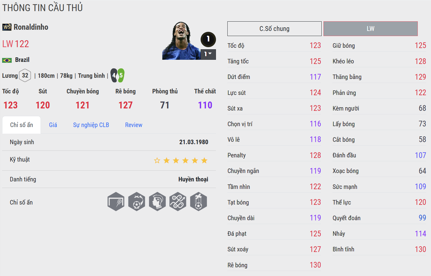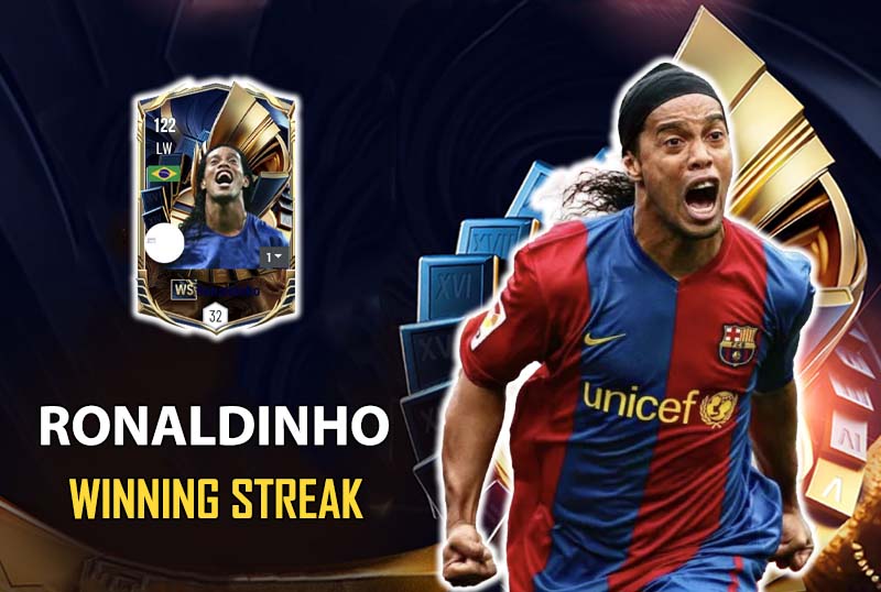 Ronaldinho mùa thẻ Winning Streak (WS) tái hiện hình ảnh một trong những nghệ sĩ bóng đá vĩ đại nhất lịch sử. Anh mang đến cảm giác chơi bóng đầy ma mị, ngẫu hứng và bùng nổ, có thể biến mọi khoảnh khắc tưởng chừng bình thường thành kiệt tác. Trong FC Online, Ronaldinho WS là sự kết hợp giữa kỹ năng ảo diệu và tính hiệu quả thực chiến.