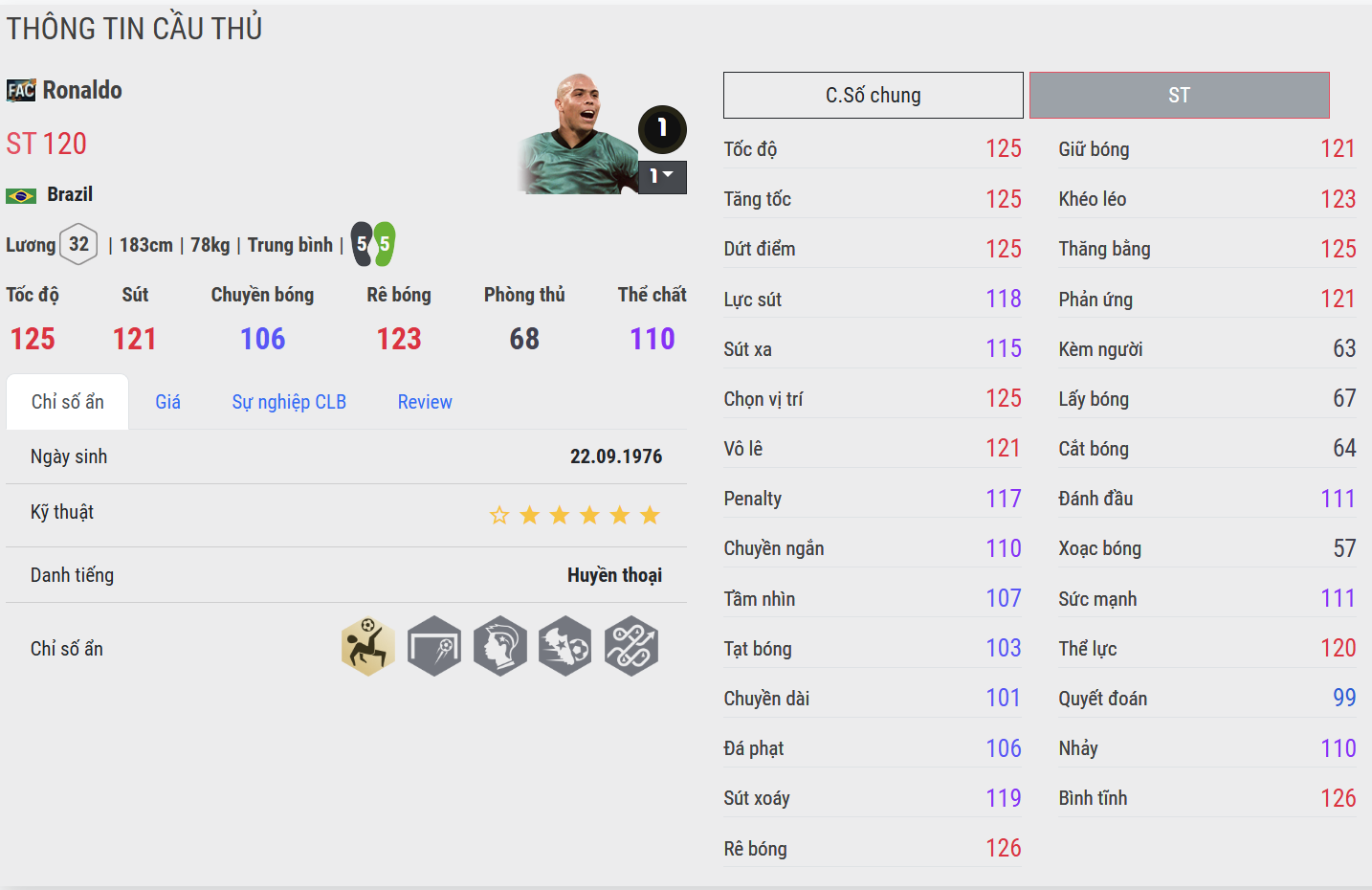 Anh là sự kết hợp hiếm có giữa sức mạnh, sự uyển chuyển và bản năng săn bàn thiên phú, khiến mọi hàng thủ thời đại ấy đều phải run sợ mỗi khi anh chạm bóng. Từ PSV, Barcelona, Inter Milan đến Real Madrid, Ronaldo luôn để lại dấu ấn của một thiên tài – người tạo ra những khoảnh khắc khiến cả thế giới phải nín thở.