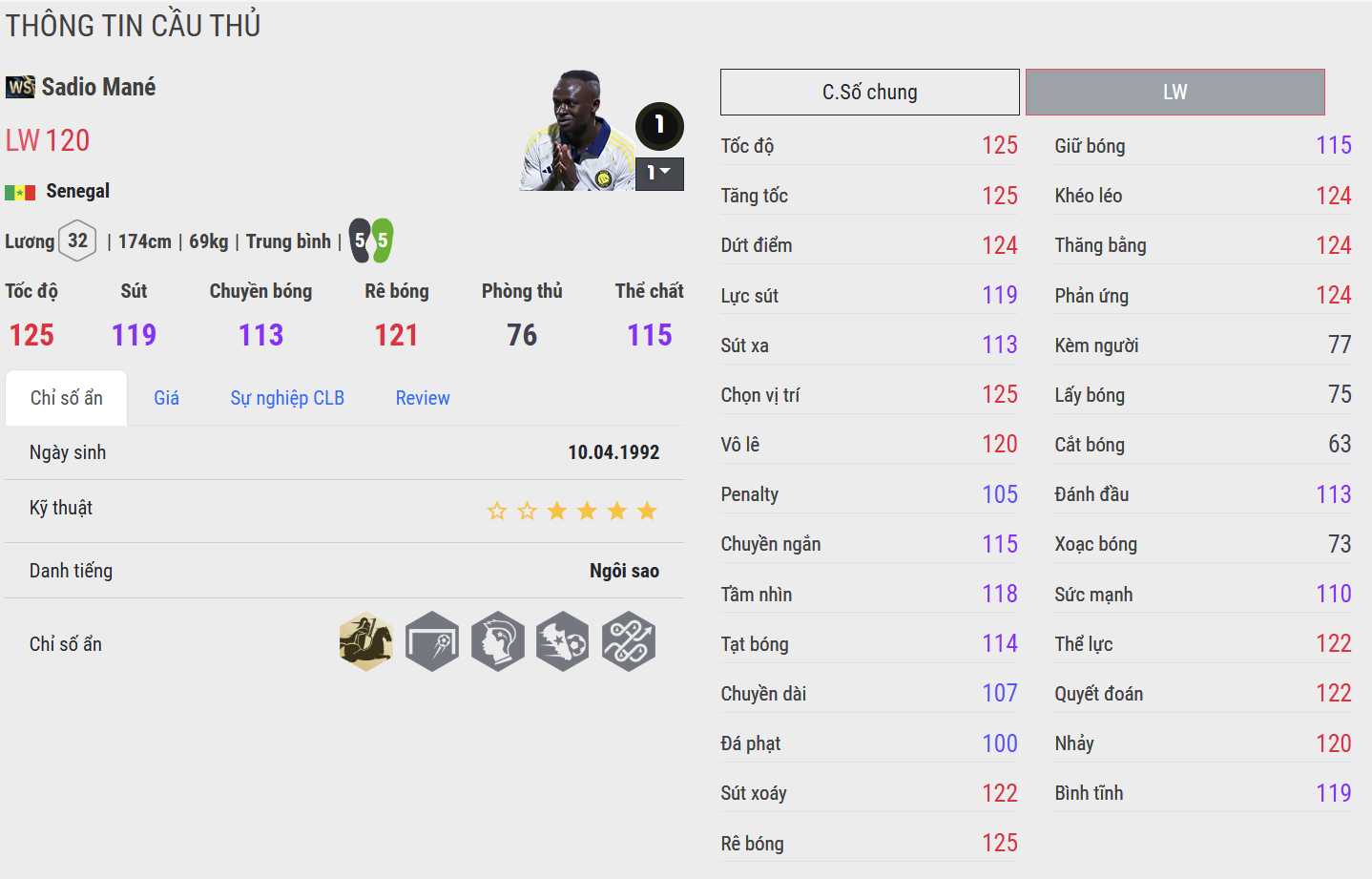 Mané WS sở hữu tốc độ cực nhanh, nằm trong nhóm đầu của các cầu thủ chạy cánh trong game. Anh tăng tốc mạnh mẽ chỉ sau 1–2 nhịp chạm, đặc biệt lợi hại ở các pha phản công hoặc thoát xuống từ cánh trái. Cảm giác bứt tốc mượt, chân chạy nhỏ, đều và có độ dính bóng cao giúp Mané không bị chậm lại khi rê. Trong thế 1v1, chỉ cần một cú đẩy bóng là anh có thể bỏ xa hậu vệ đối phương – đúng hình ảnh “máy bay phản lực” của Anfield năm nào.