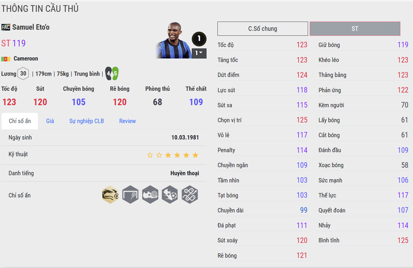 Eto’o FAC không phải mẫu tiền đạo kiến thiết, nhưng chuyền bóng ở mức đủ dùng. Những pha nhả bóng một chạm, bật tường nhanh với CAM hoặc ST cặp rất tròn vai. Chuyền sệt ngắn khá ổn, ít lỗi. Tuy nhiên, không nên kỳ vọng vào các pha QW hay chuyền dài – Eto’o sinh ra để dứt điểm nhiều hơn là làm bóng.