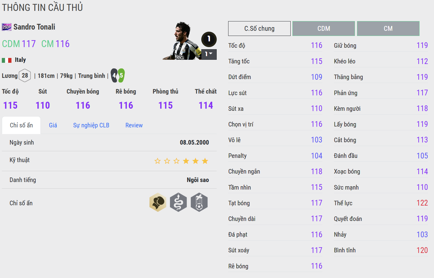 Đây chính là điểm mạnh nhất của Tonali 25DP. Anh sở hữu: Sức mạnh tay đôi tốt, Thăng bằng cao, Animation va chạm cực lì, Khả năng ghì người và cản bóng rất khó chịu. Trong các tình huống tranh chấp trực diện, Tonali gần như luôn chiếm ưu thế. Dù không cao to như những CDM “xe lu” kiểu Vieira, nhưng độ lỳ và gân guốc của Tonali đủ khiến anh trở thành một chốt chặn cực kỳ khó chịu.