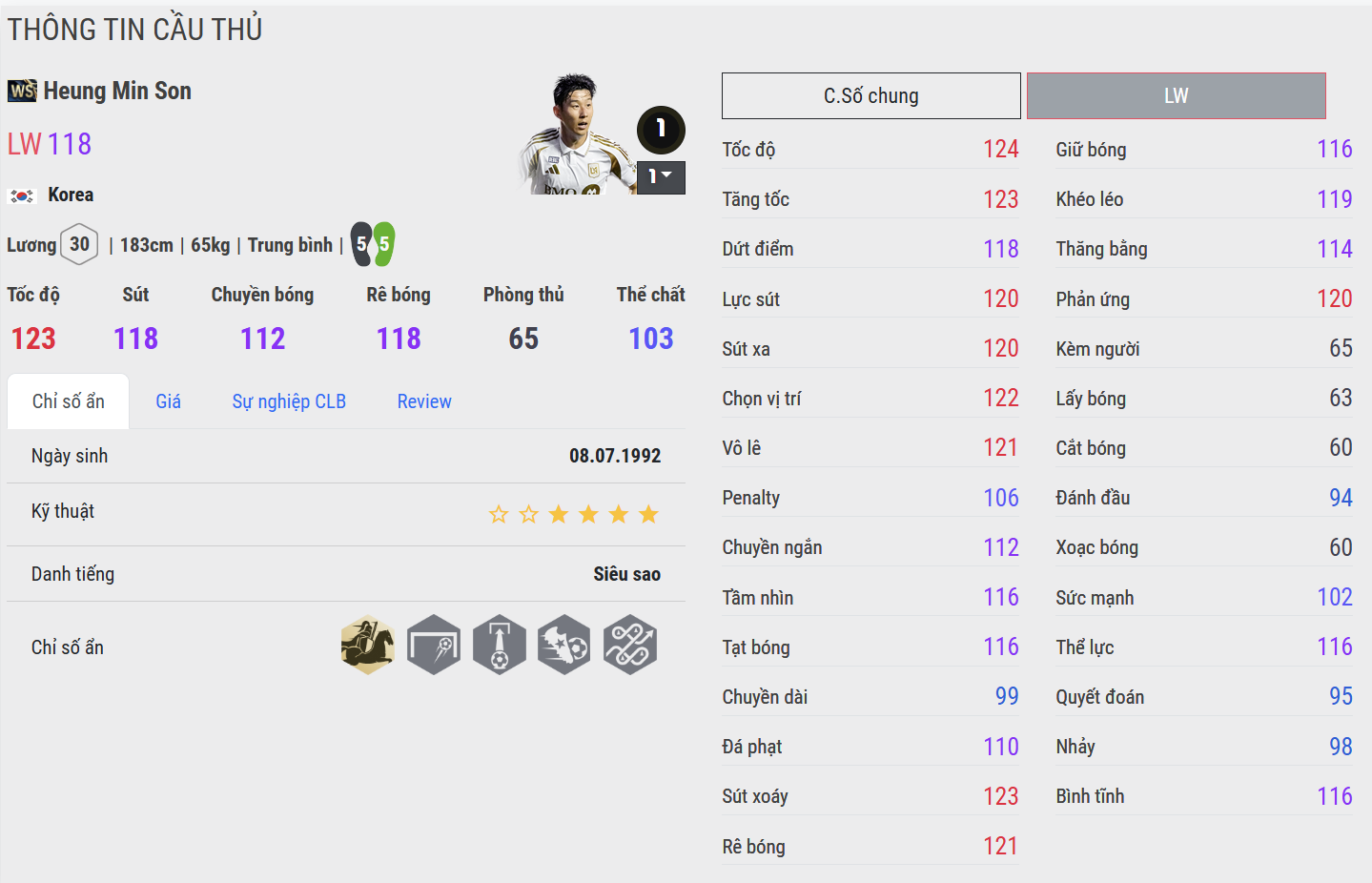 Son WS sở hữu tốc độ thuộc hàng đầu trong game. Anh bứt tốc cực nhanh ở những pha di chuyển đầu tiên, dễ dàng vượt qua hậu vệ khi có khoảng trống. Cảm giác “vút đi” của Son rất mượt, nhất là khi dẫn bóng song song với biên. Đáng chú ý, anh không bị hụt nhịp khi rê bóng ở tốc độ cao – một ưu điểm giúp Son giữ nhịp tấn công liên tục mà không mất kiểm soát. Dù ở cánh hay trung lộ, tốc độ chính là thứ giúp anh tạo nên khác biệt.