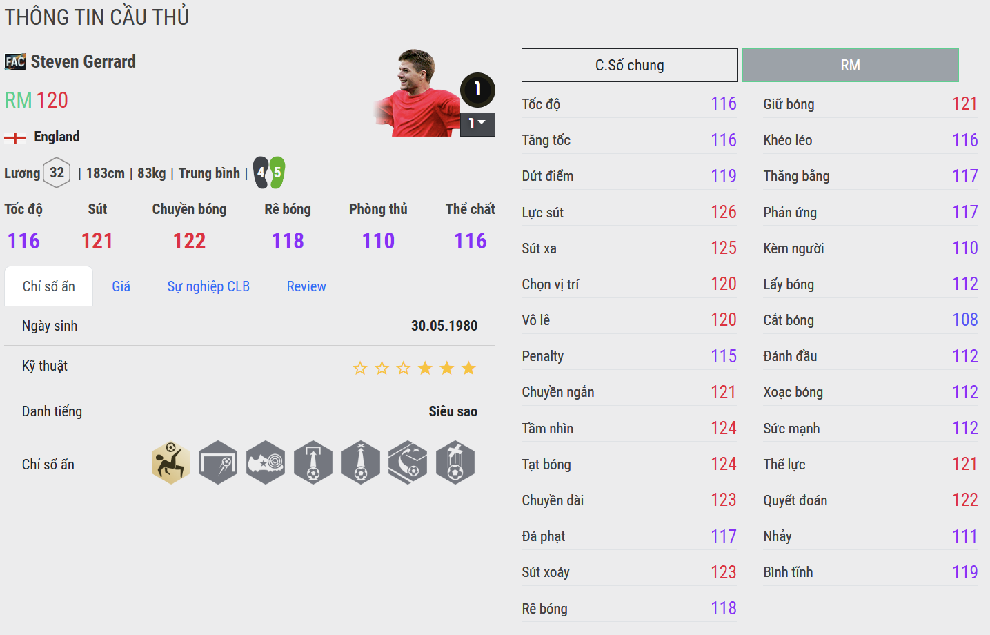 Gerrard không phải mẫu kỹ thuật mềm mại, nhưng rê bóng rất “người lớn”: gọn, chắc và đầy chủ động. Trọng tâm giữ vững khi đổi hướng, xử lý ít thừa động tác nên hiếm khi để mất bóng vô duyên. Khả năng tận dụng những nhịp chạm bóng nhỏ để tạo không gian cho cú sút xa cũng là điểm rất đáng giá của thẻ này.
